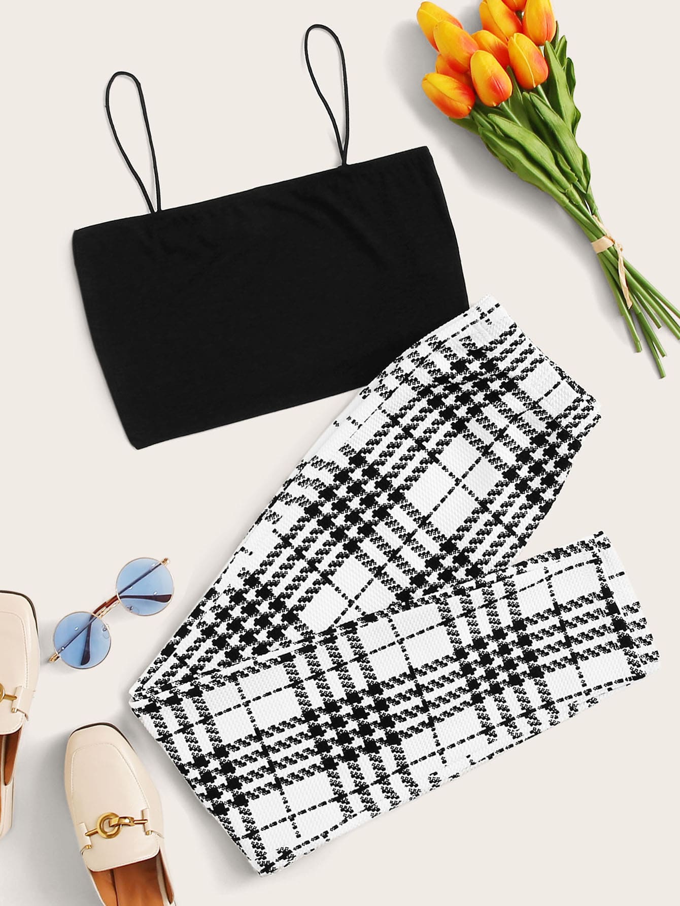 Solid Cropped Cami Top & Plaid Leggings Set