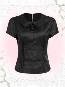 Solid Peter Pan Collar Knot Front Satin Blouse