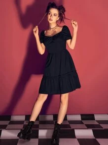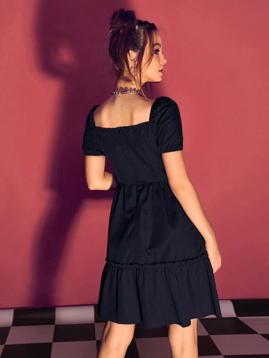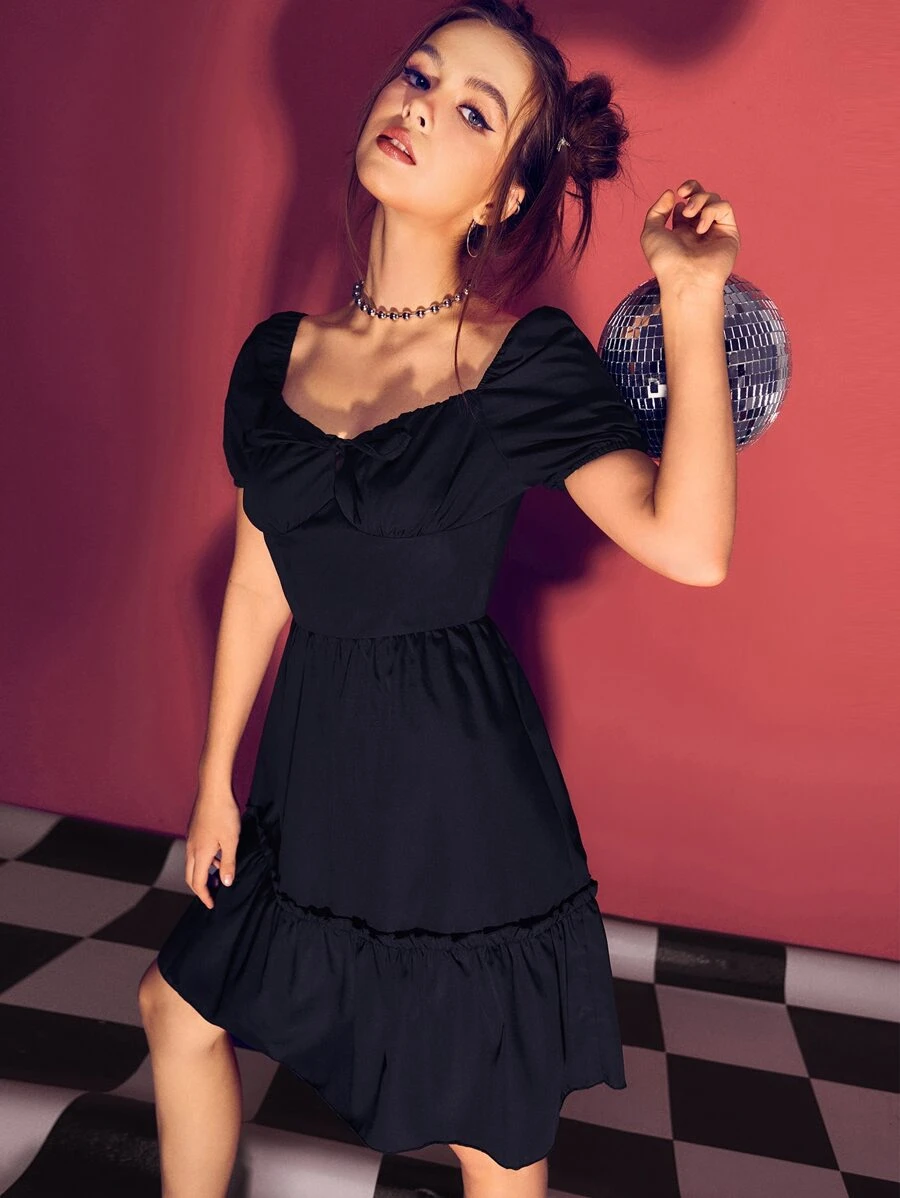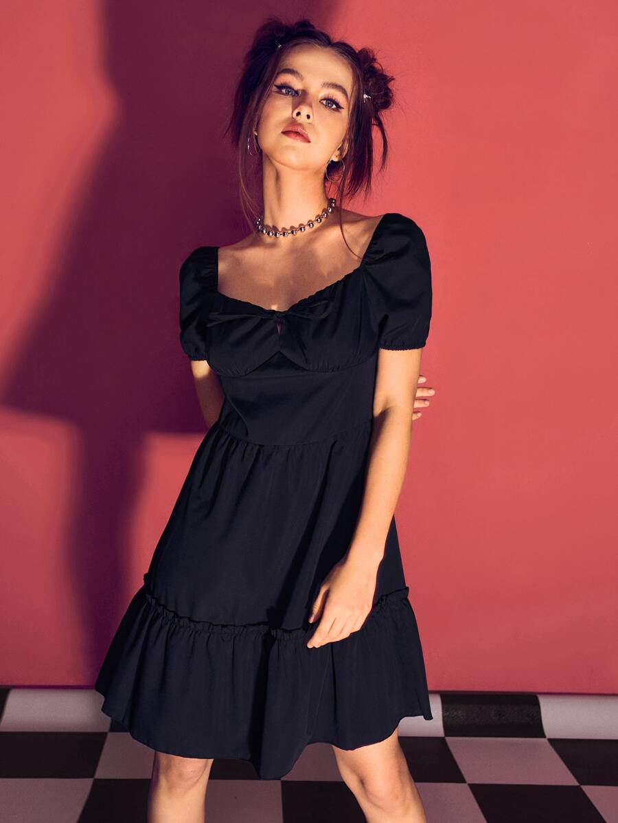 Solid Puff Sleeve Bow Frill Dress