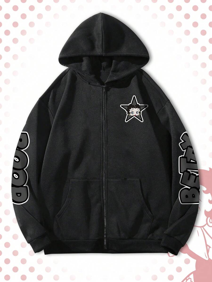 Betty Boop | ROMWE Spring Casual Graphic Men'S Fuchsia Zip-Up Hoodie With Cartoon Graphic, Comfortable For Autumn/Winter