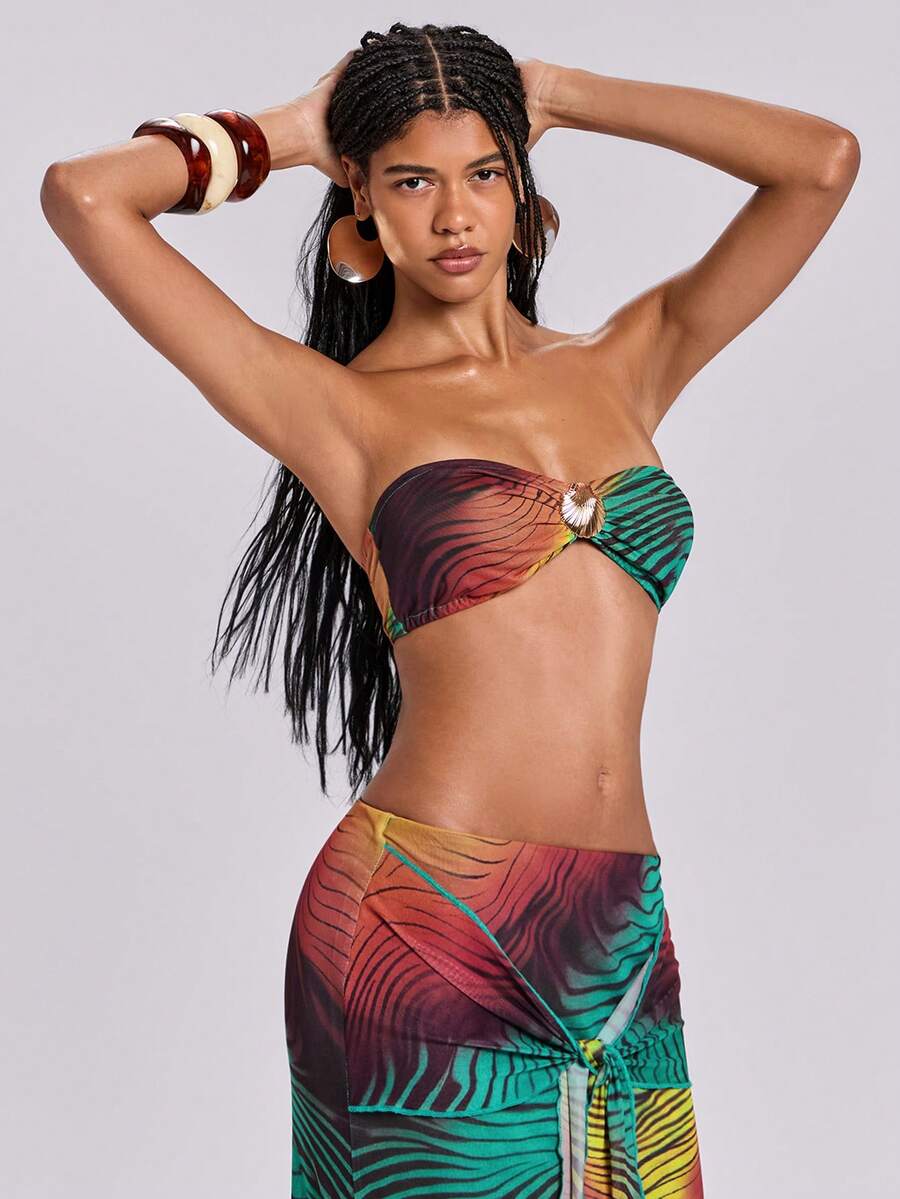 Spring/Summer Vacation Style Ombre Striped Print Shell Metal Bandeau Top And Fitted Maxi Skirt Set For Women