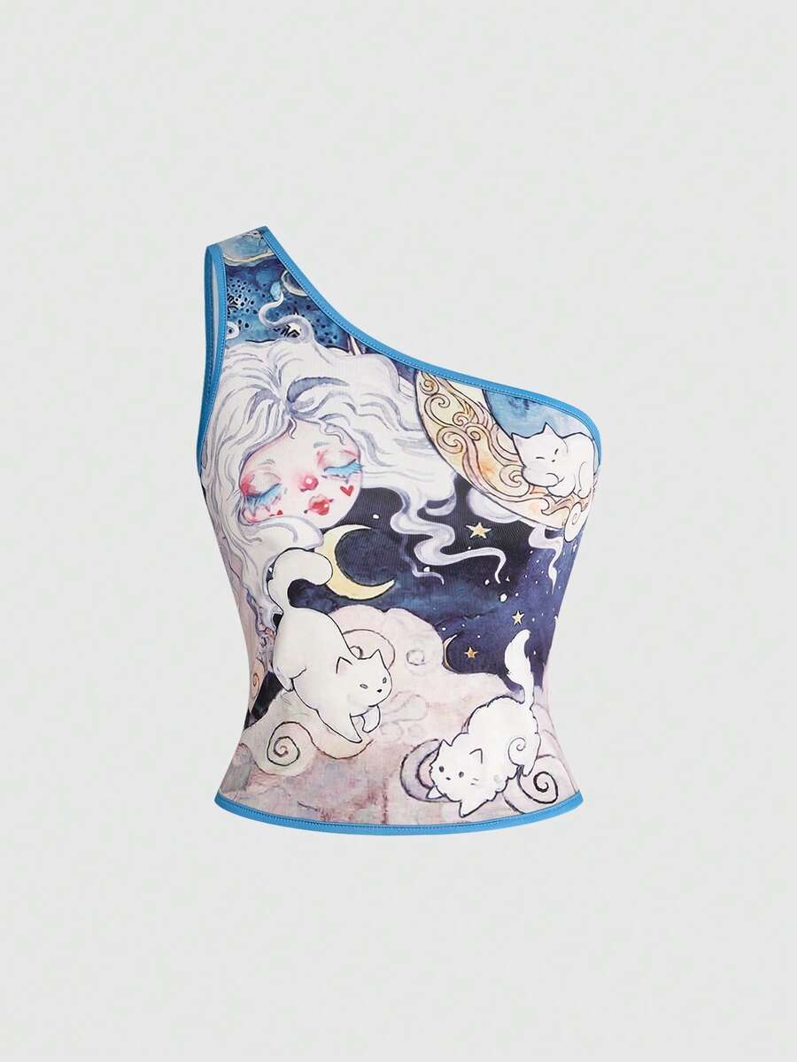 Spring/Summer Vacation Y2K Sexy Sweet Shorts, Cute Girl Cat Print Personalized Spaghetti Strap Crop Top, Front Full Print Contrast Trim Camisole