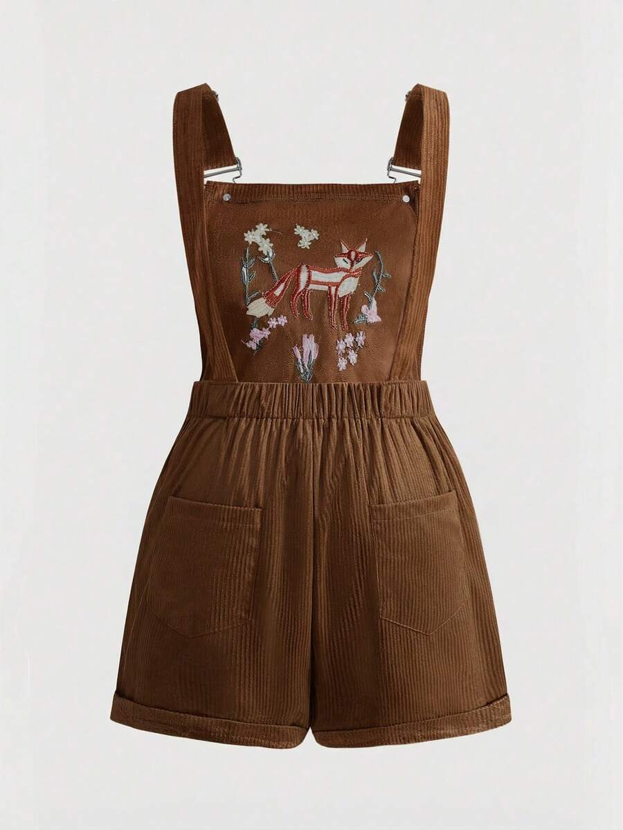Fairycore Spring/Summer Plus Size Retro Forest Fox Embroidered Corduroy Jumpsuit