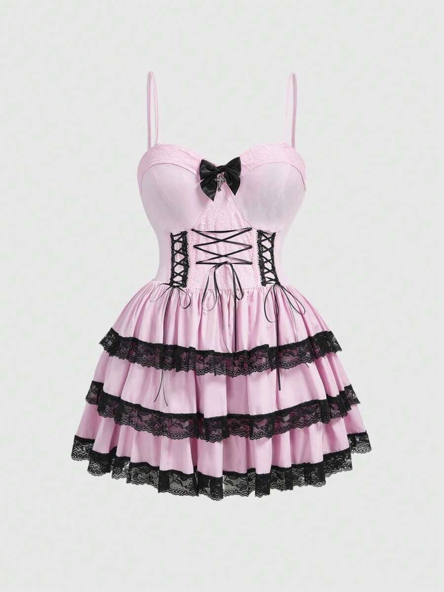 Kawaii Spring/Summer Plus Size Women Lace Trim Bow Tie Cami Dress, Sweet & Cool Pink & Black Dress