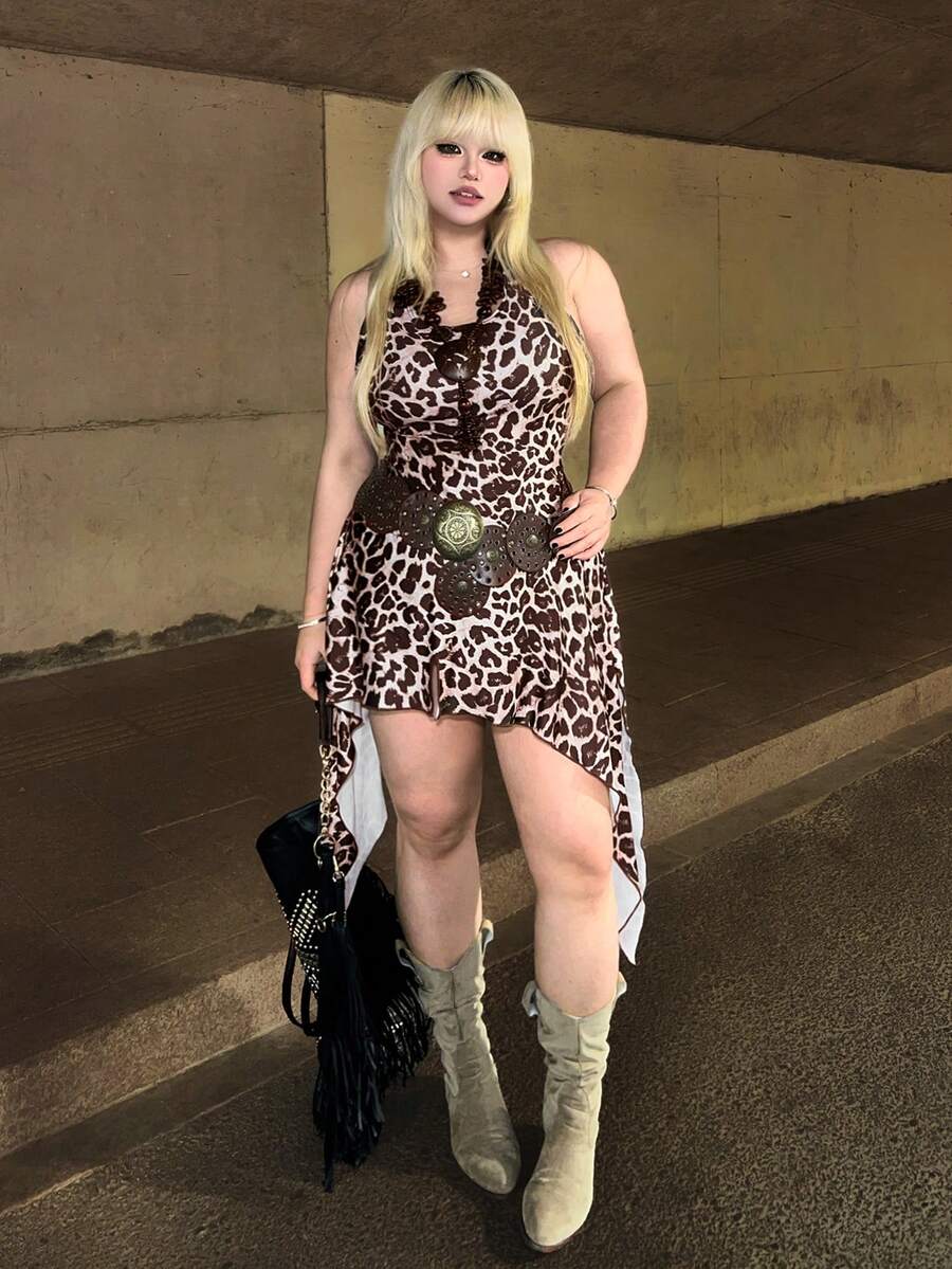 Spring/Summer Plus Size Y2K Leopard Print Spaghetti Strap Backless Maxi Dress, Sexy Street Style Irregular Hem Dress, Retro Sexy Hippie Daily Maxi Dress Valentine's Day