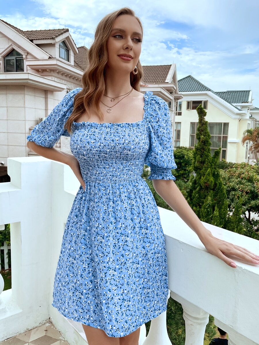 Square Neck Shirred Bodice Allover Plants Dress