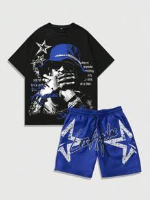 Street Life 2pcs Men's Casual Slogan Graphic T-Shirt And Shorts Set, Summer