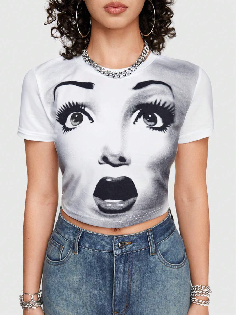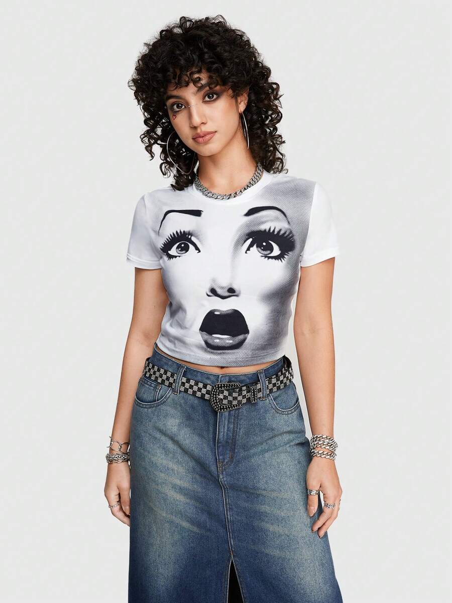 Street Life Avant-Garde Streetwear Sexy Tight Short Sleeve T-Shirt With Portrait Print