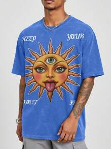 Street Life Casual Fashion Washed Blue T-Shirt, With Vibrant Cartoon Graphic Design. Overall A Relaxed And Playful Style, Vacation