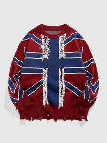 Street Life Fashionable Vintage Flag Intarsia Knit Sweater, Casual Loose Fit Pullover For Men, Winter, Fall