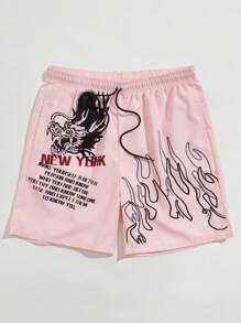 Street Life Guys Slogan & Fire Print Drawstring Waist Shorts