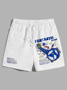 Street Life Men Cartoon & Slogan Graphic Drawstring Waist Shorts, School