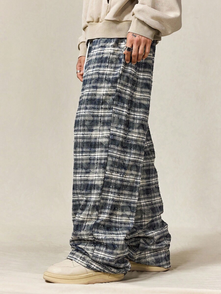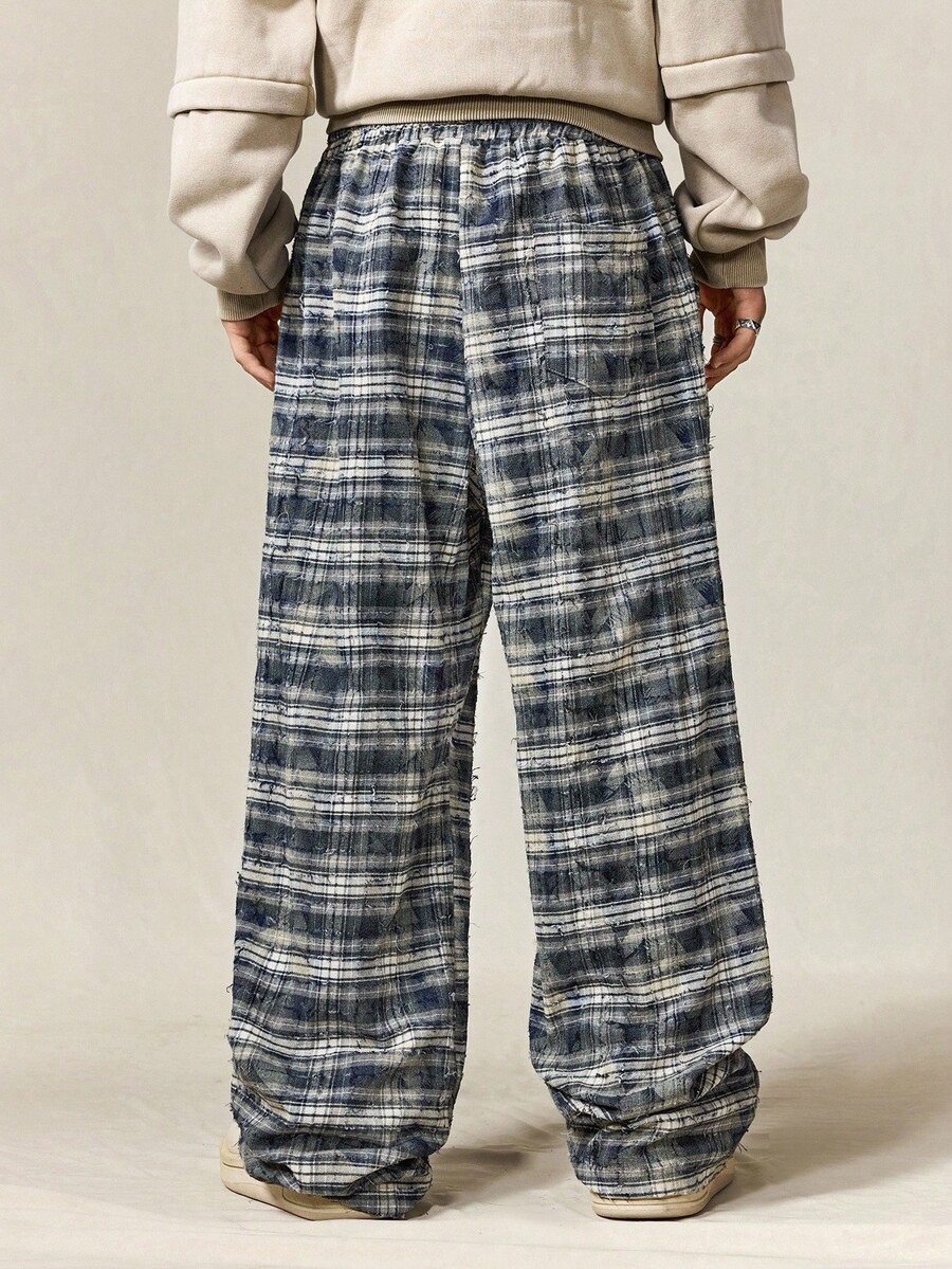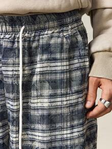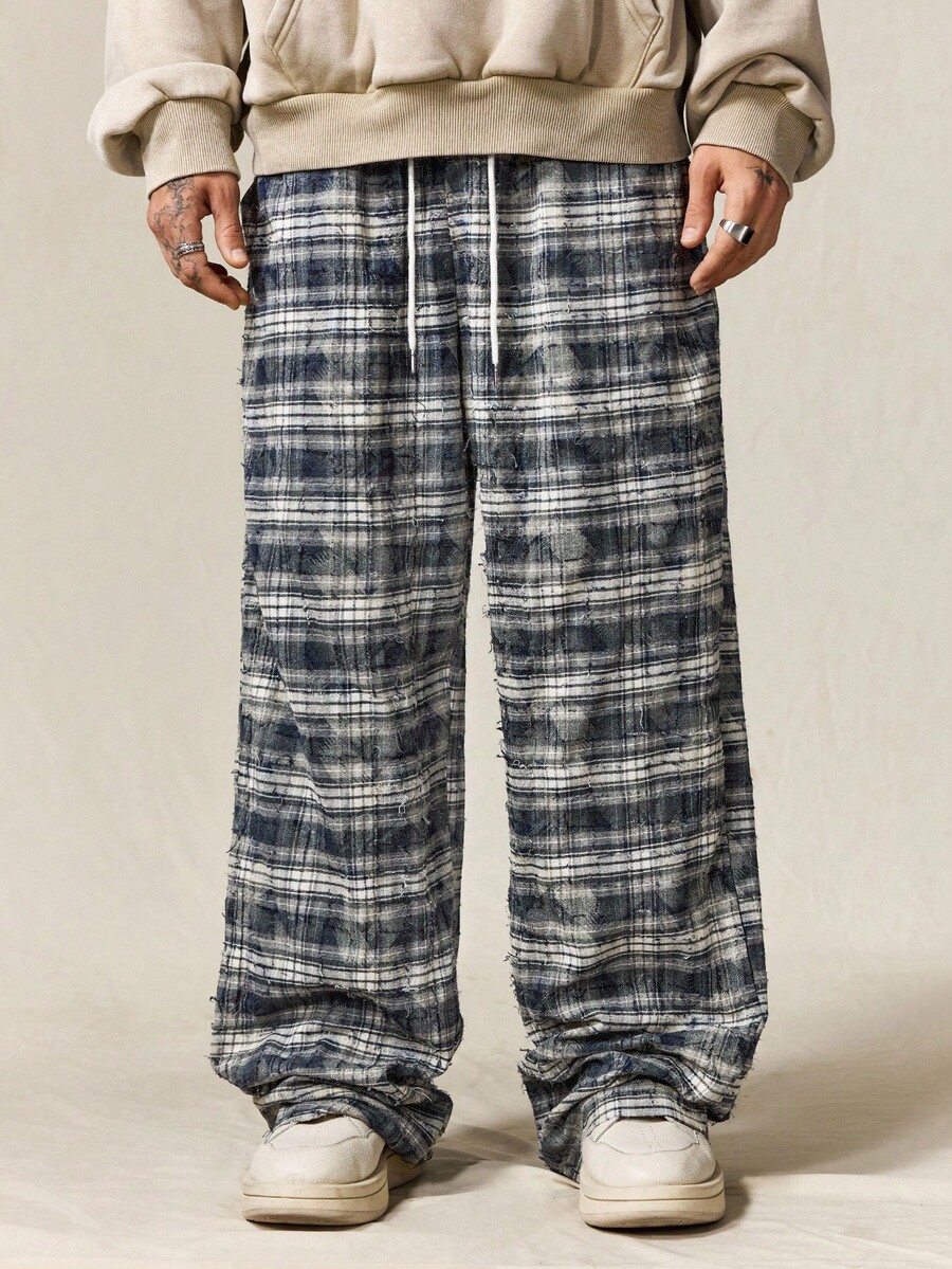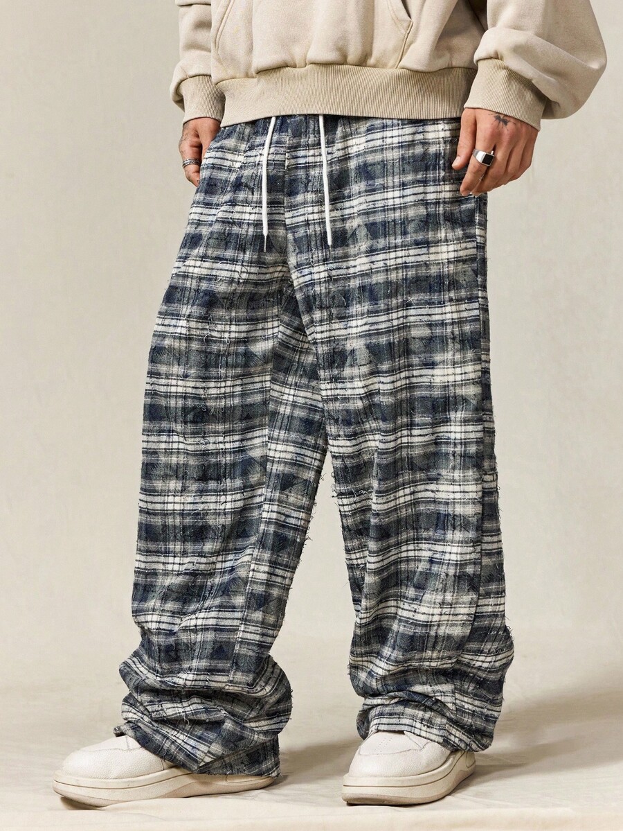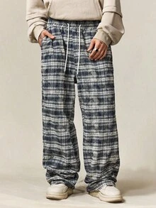 Street Life Men Fashion Street Collegiate Style Plaid Print Drawstring Waist Loose Wide Leg Pants, Fall