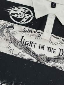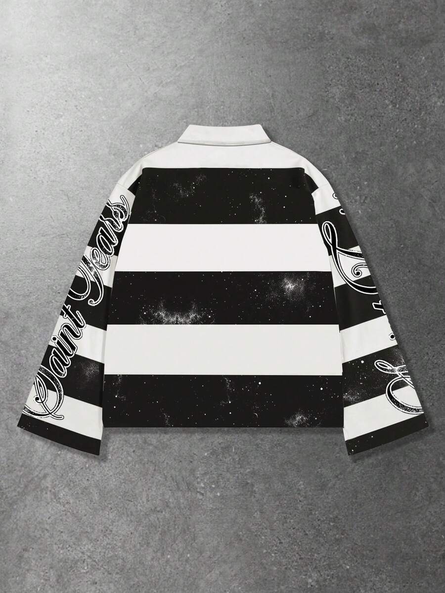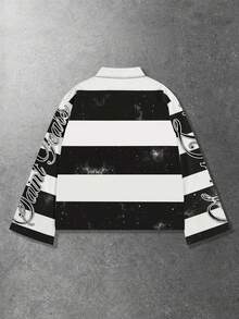 Street Life Men Striped Collar Long Sleeve Printed T-Shirt, Casual College Style Top, Fall