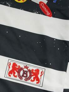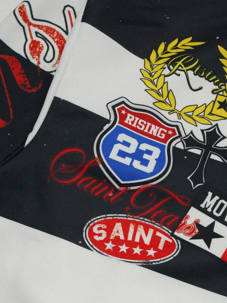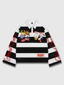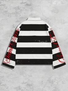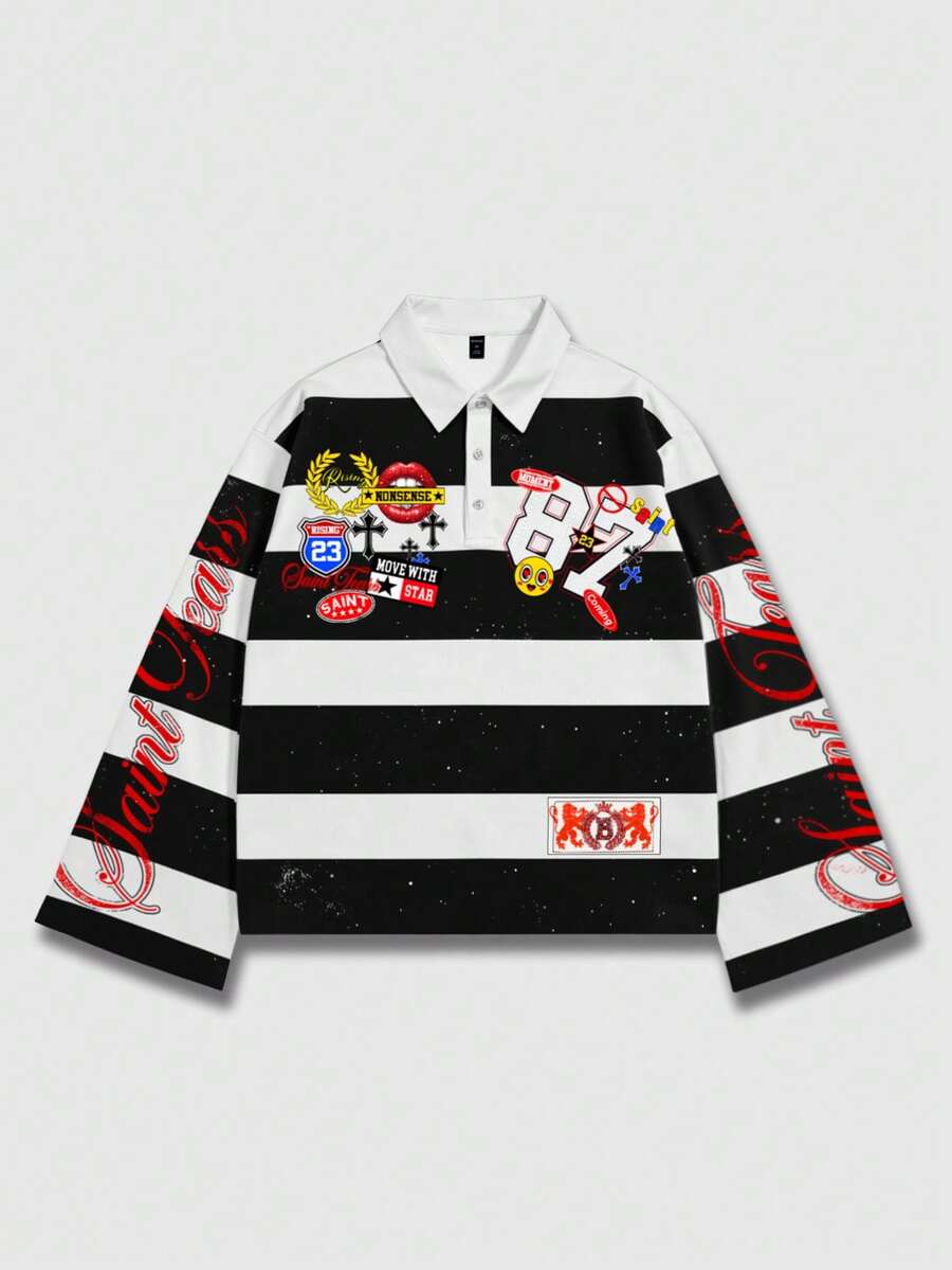 Street Life Men Striped Collar Prep Long Sleeve Printed T-Shirt, Casual College Style Top, Fall