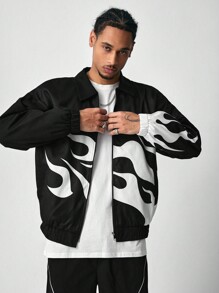 Street Life Men White Flame Print Black Jacket With Elastic Hem And Cuffs