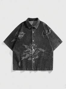 Street Life Men's Angel Print Button-Up Denim Shirt For Summer