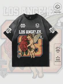 Street Life Men's Angel & Rose Portrait Print Casual Short Sleeve T-Shirt, Suitable For Spring/Summer