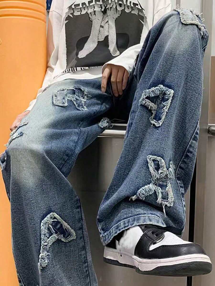 Street Life Men's Casual Frayed Baggy Jeans With Letter Patchwork