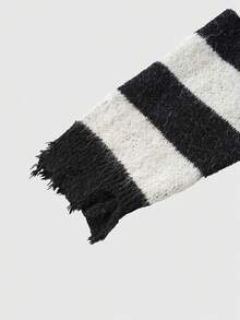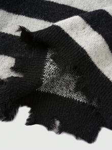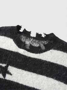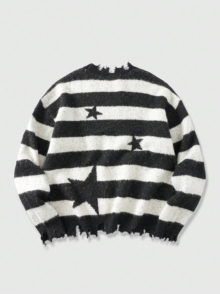Street Life Men's Casual Punk Fashion Street Black & White Striped And Star Pattern Distressed Edge Loose Fit Sweater, Autumn/Winter