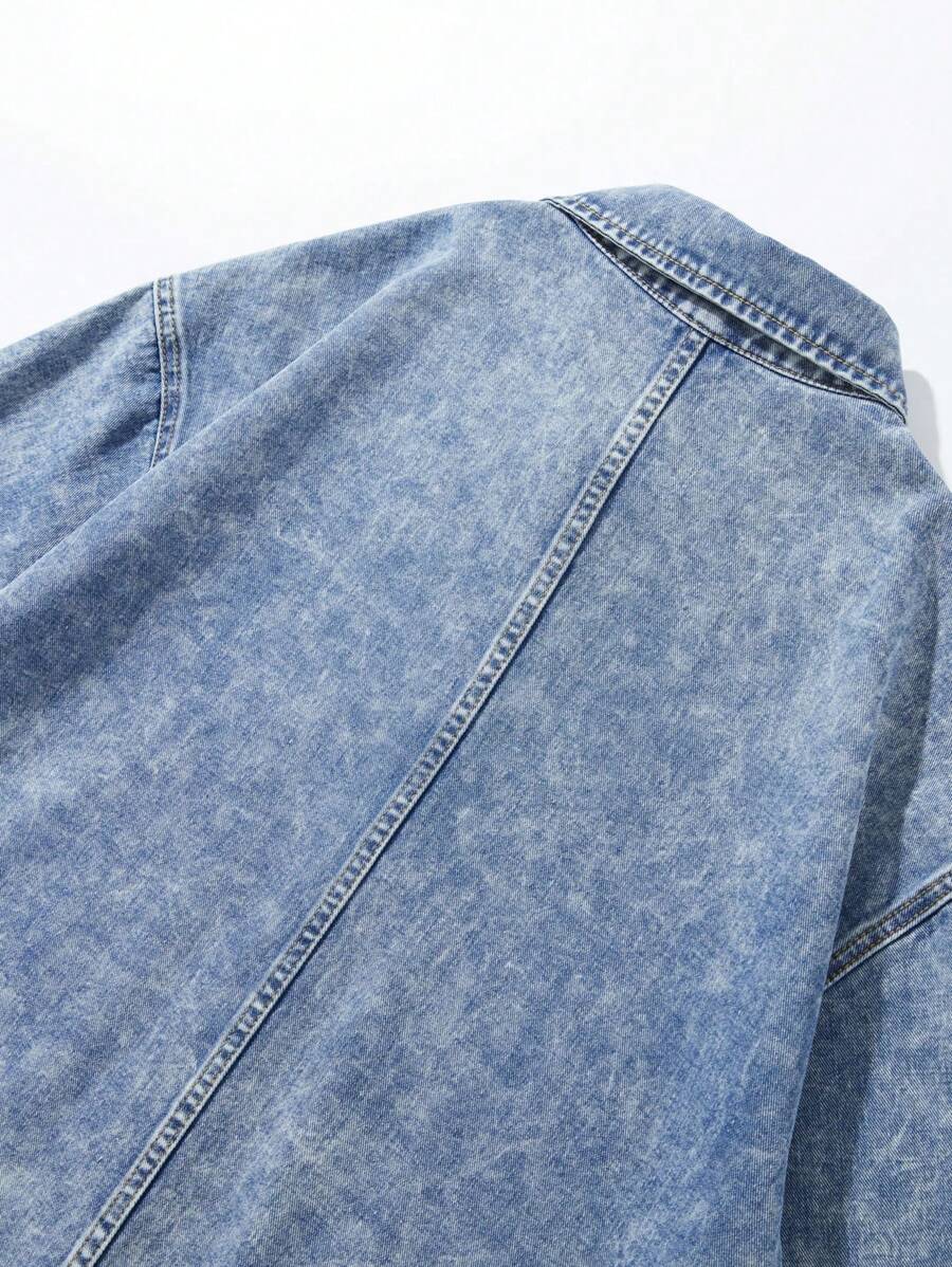Street Life Men's Casual Washed Color-Block Frayed Edges Star Printed Denim Shirt