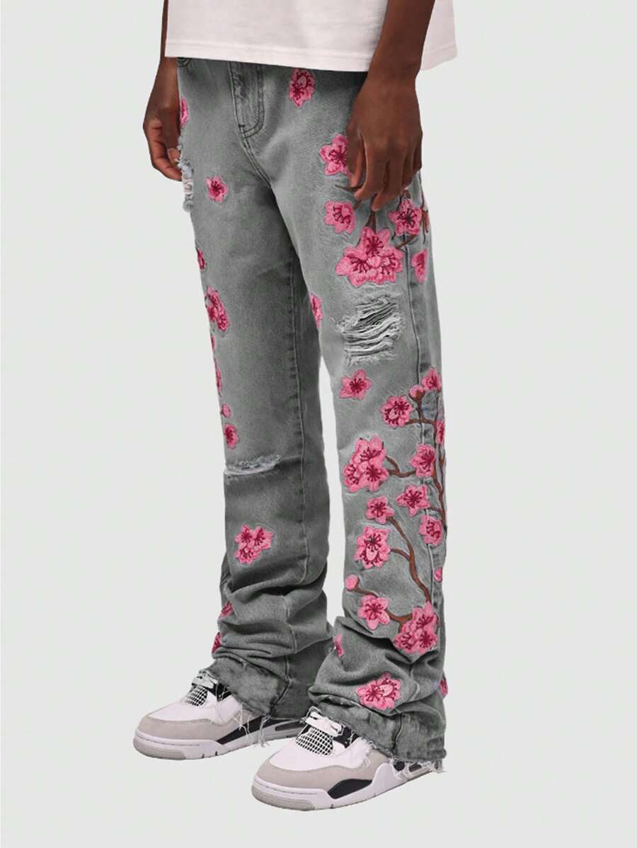 Street Life Men's Casual Washed Floral Embroidery Ripped Jeans