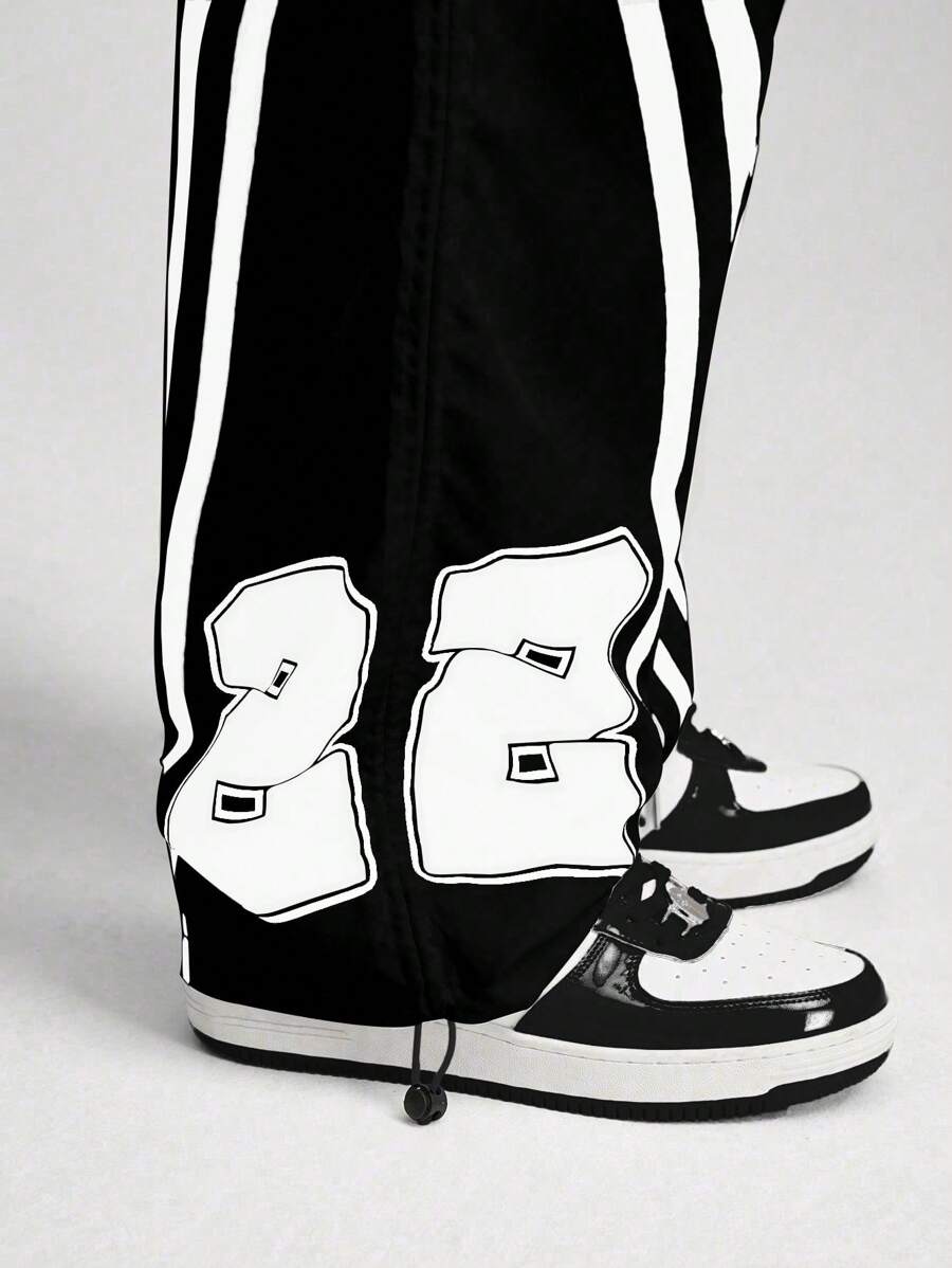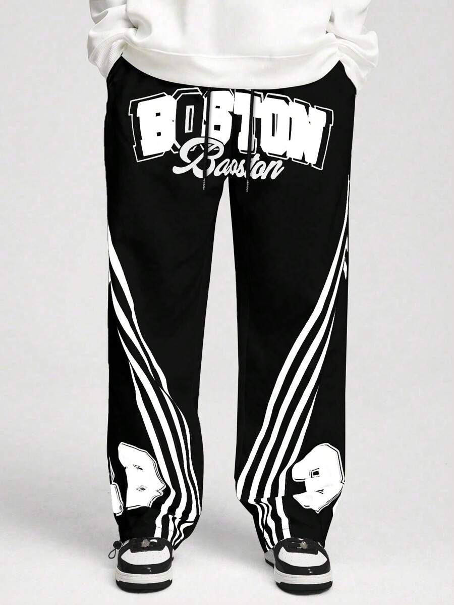 Street Life Men's Contrast Stripe Drawstring Waist Letter Graphic Baggy Pants, Fall