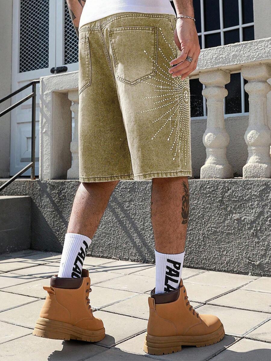 Street Life Men's Diamond Rhinestone Decor Denim Shorts Jorts, Fashionable For Summer