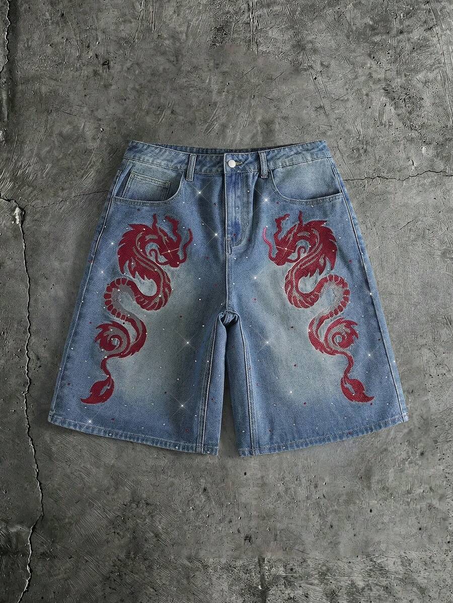 Street Life Men's Dragon Pattern Rhinestone Embellished Denim Shorts