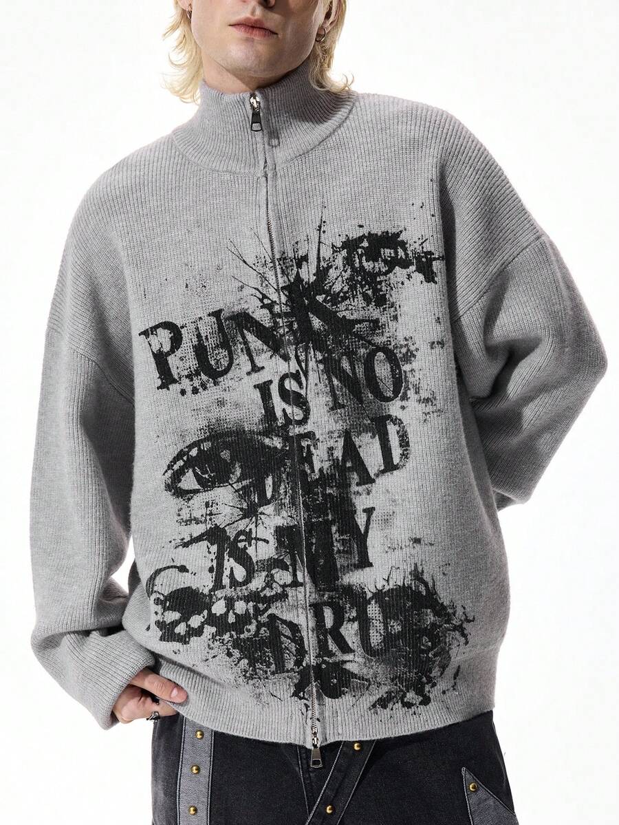 Street Life Men's Eye & Letter Print Stand Collar Zip-Up Long Sleeve Knit Cardigan Sweater