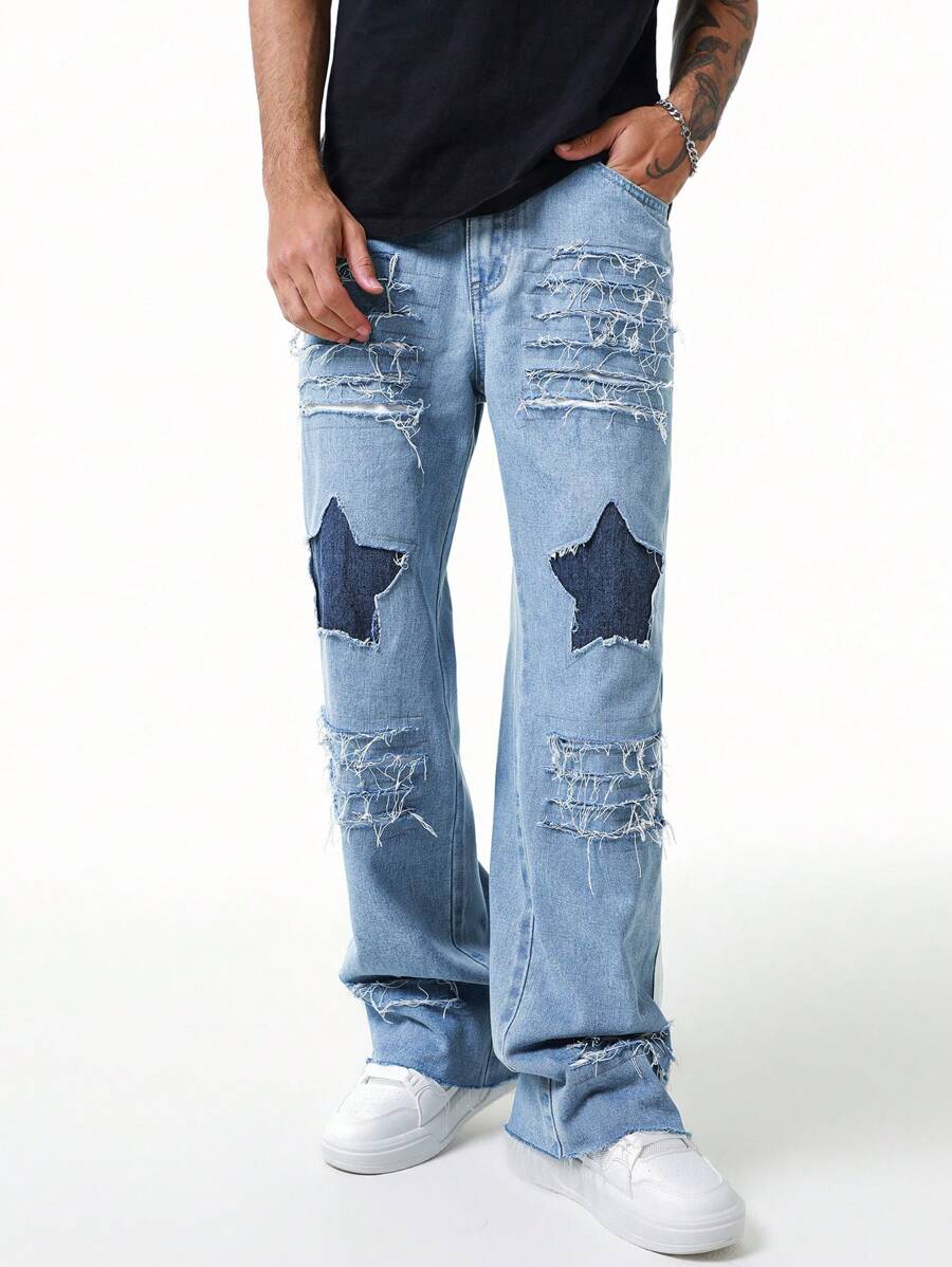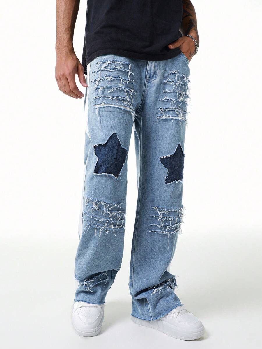 Street Life Men's Fashionable Star Ripped Distressed Frayed Hem Jeans With Pockets