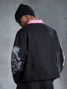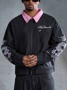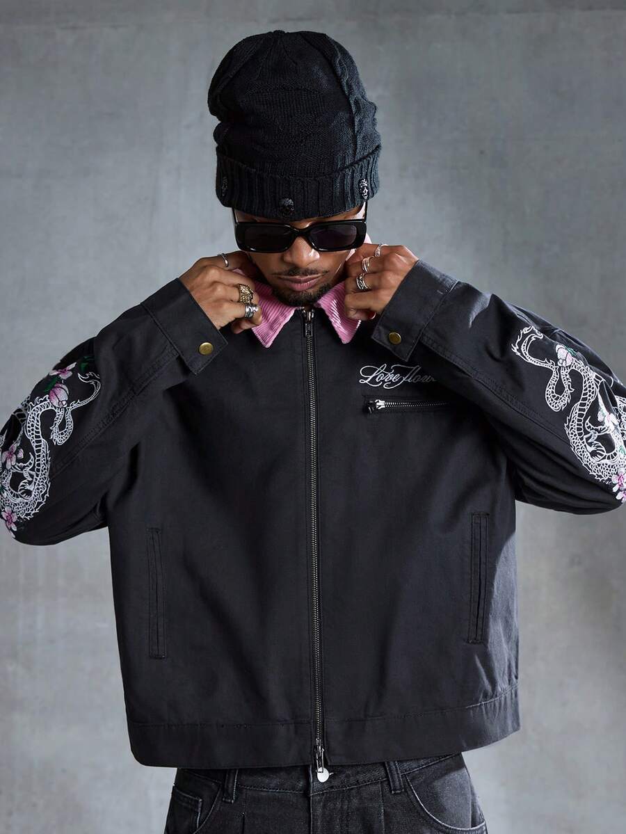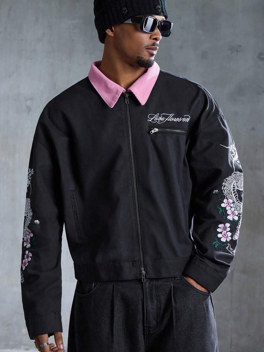 Street Life Men's Floral Embroidery Pattern Turndown Collar Zip Front Long Sleeve Denim Jacket
