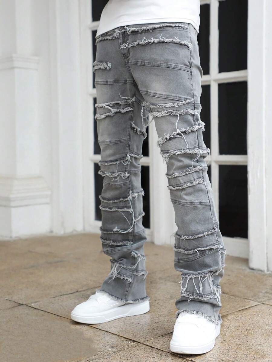 Street Life Men's Frayed Hem Patchwork Flare Leg Jeans