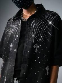 Street Life Men's Goth Fashion Cross Rhinestone Decor Denim Shirt, Halloween