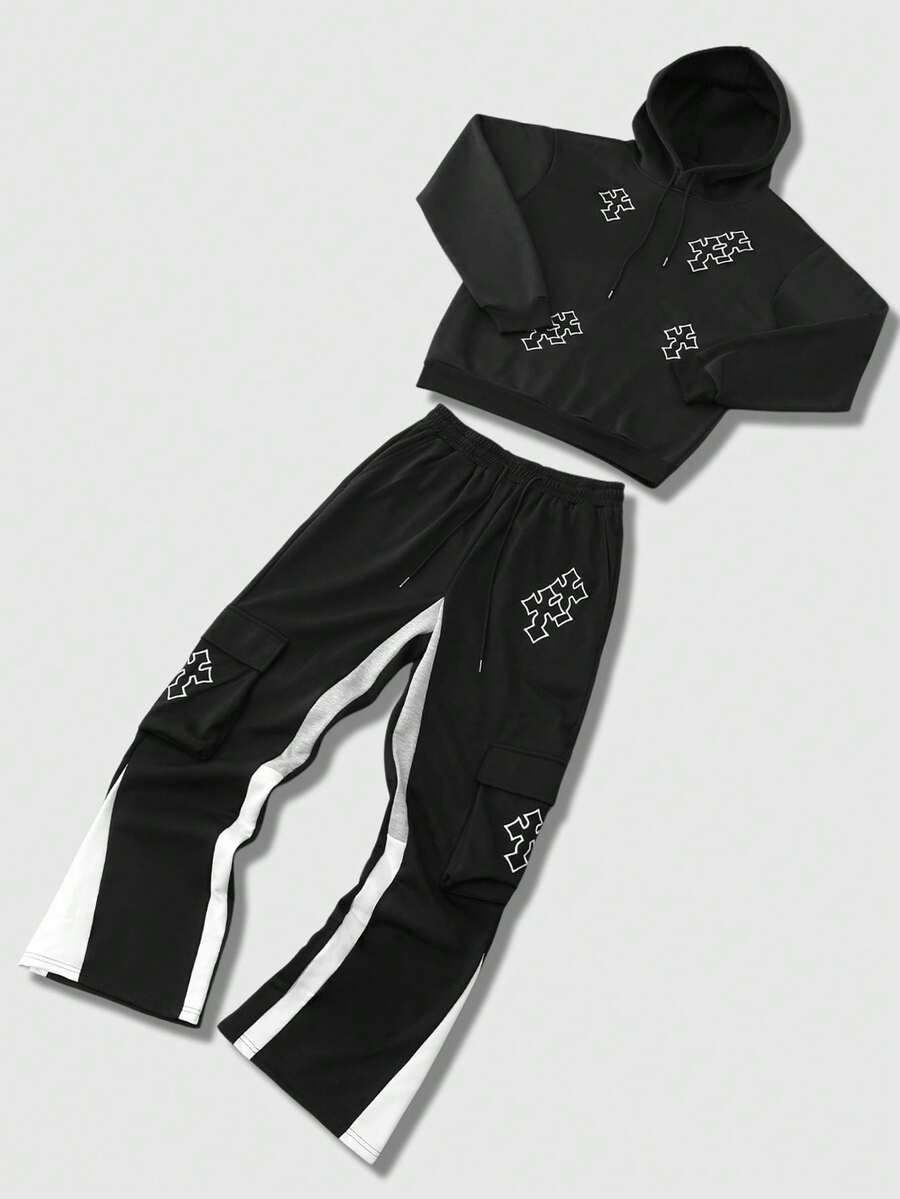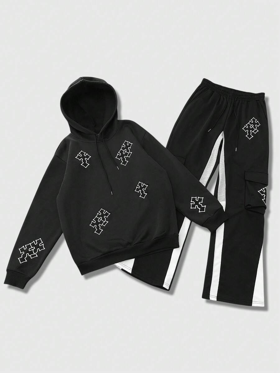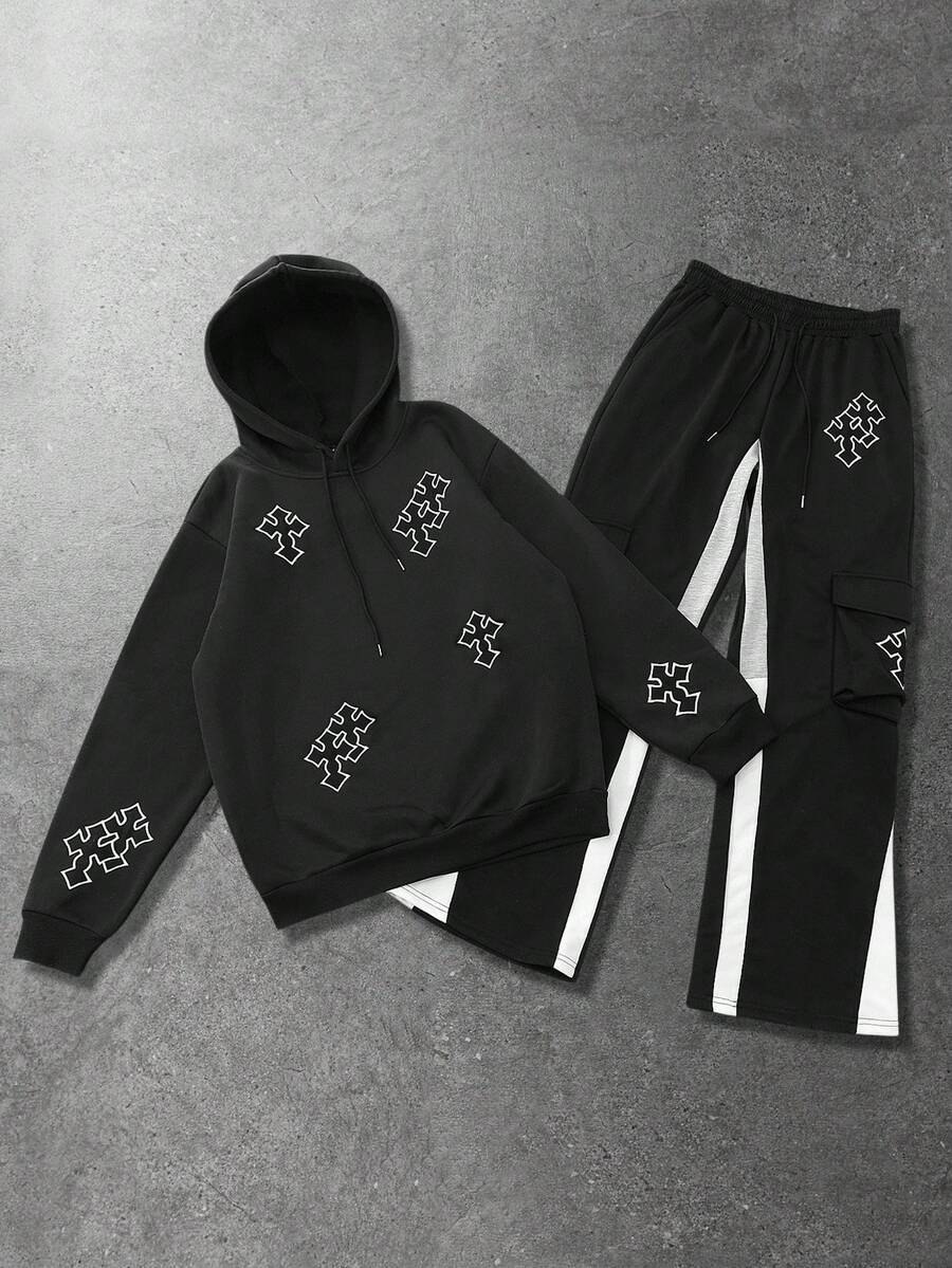 Street Life Men's Gothic Cross Print Hoodie And Flared Sweatpants Casual Tracksuit Set, Fall Clothes