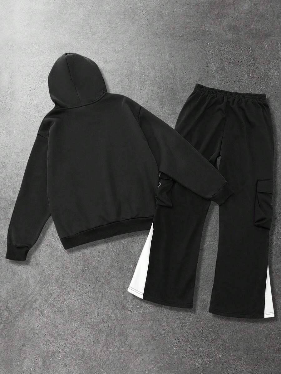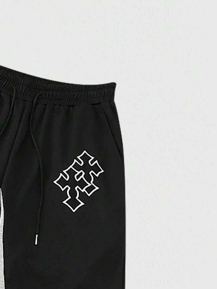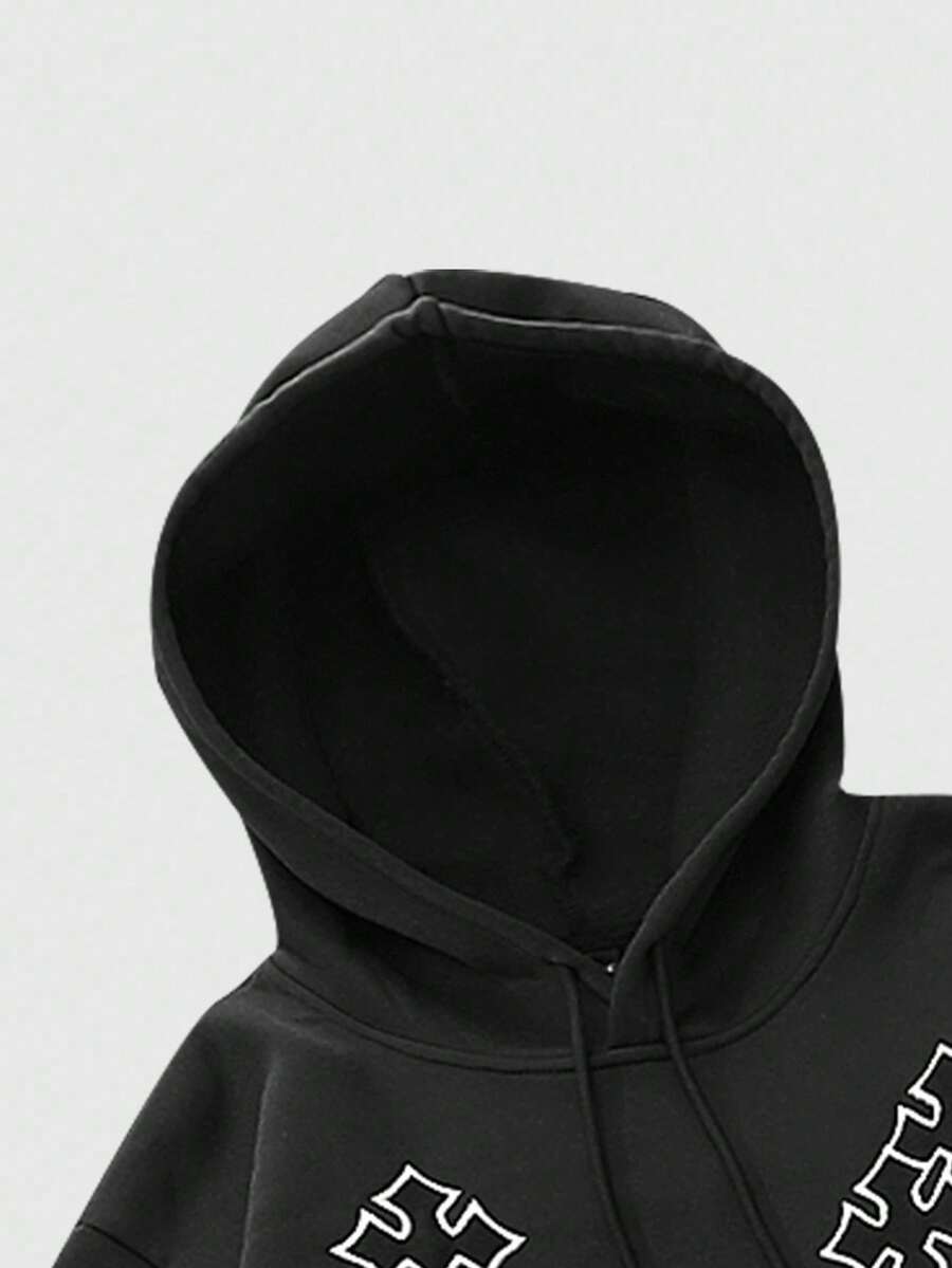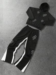 Street Life Men's Gothic Cross Print Hoodie And Flared Sweatpants Casual Tracksuit Set, Fall Clothes