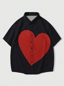 Street Life Men's Heart Print Short Sleeve Shirt, Suitable For Daily Wear In Spring And Summer, School
