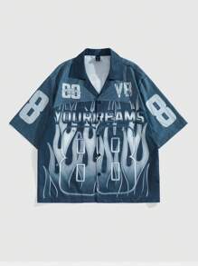 Street Life Men's Jersey Letter And Flame Print Short Sleeve Single-Breasted Casual Shirt