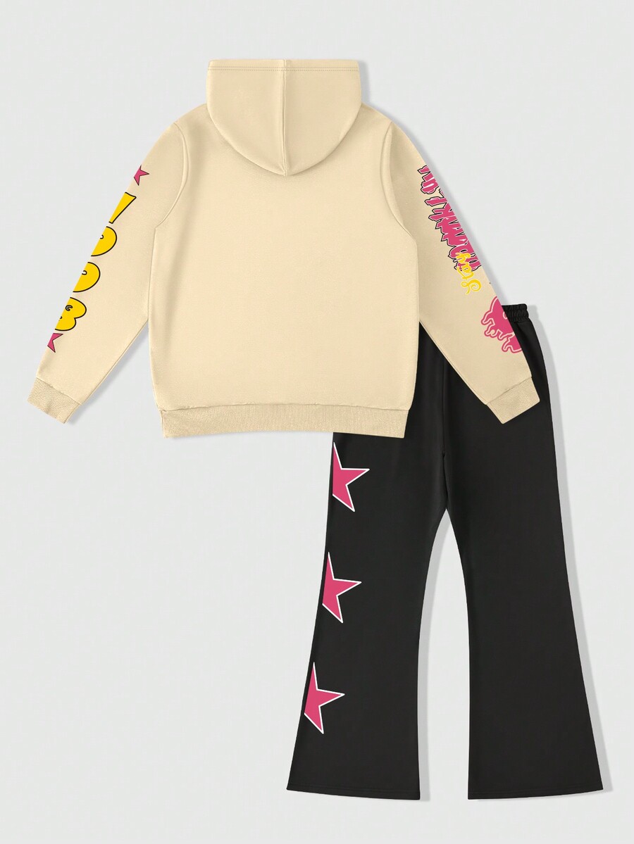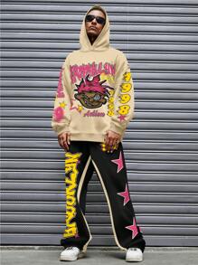 Street Life Men's Letter & Cartoon Print Hooded Sweatshirt And Sweatpants Casual Loose Fit Set, Fall/Winter