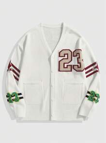 Street Life Men's Letter Jacquard V-Neck Long Sleeve Casual Cardigan With Pocket, Suitable For Everyday Wear