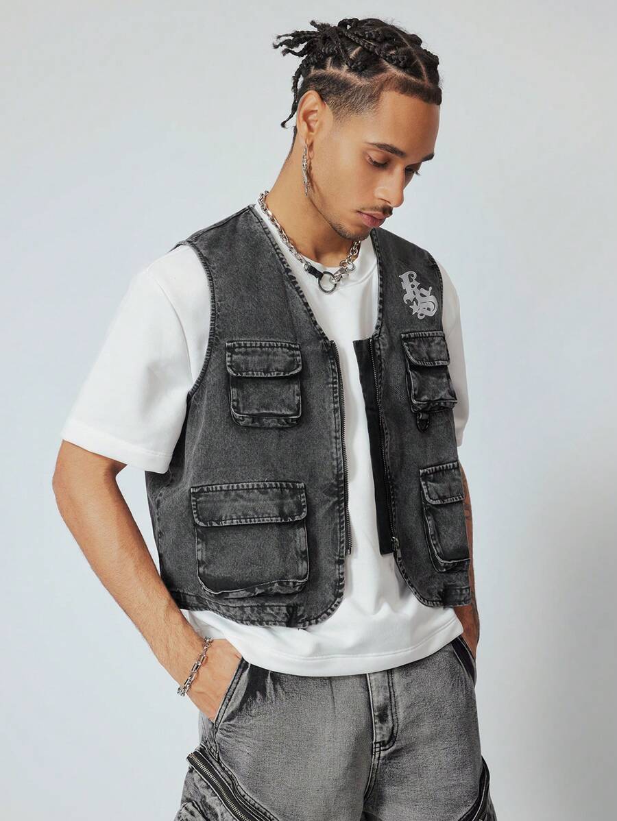 Street Life Men's Letter Print Utility Pocket Casual Vest/Jacket