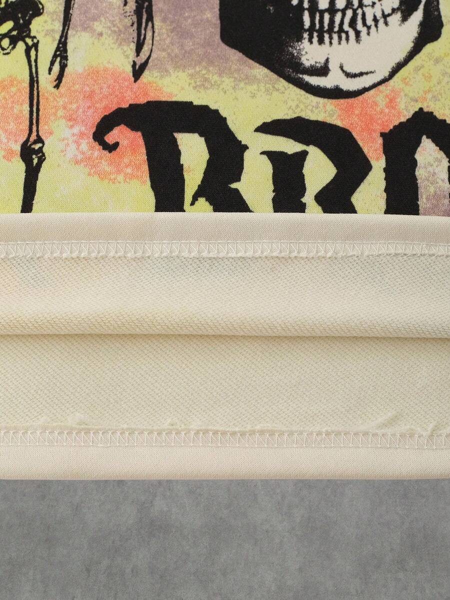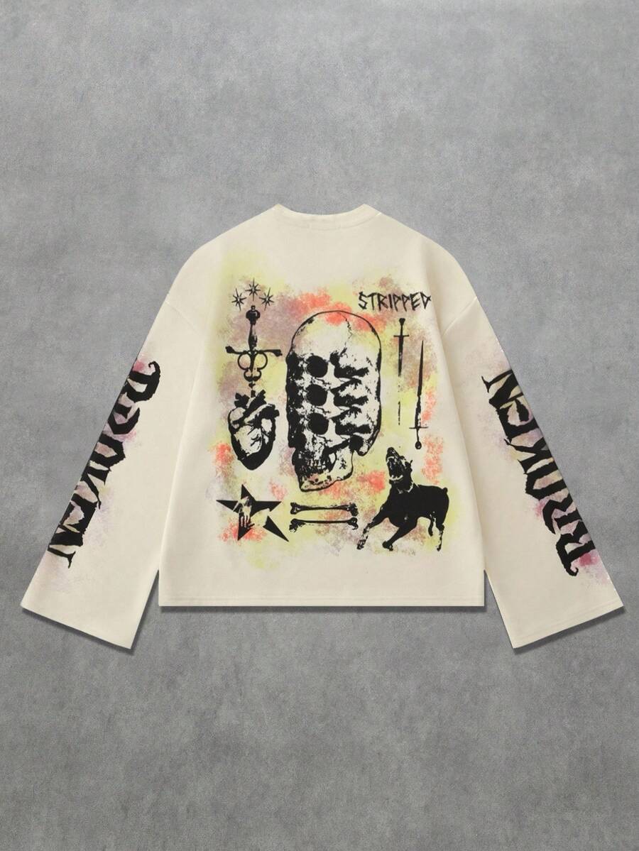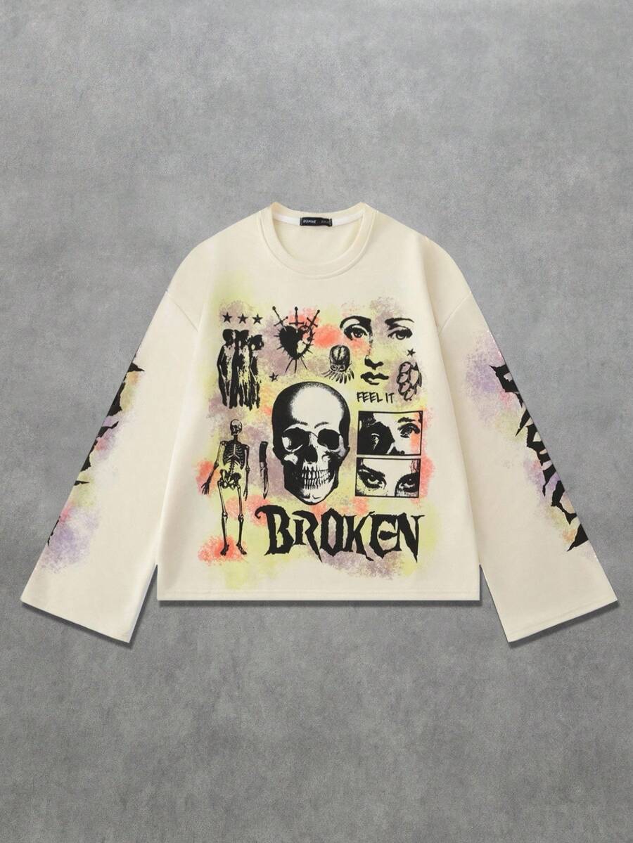 Street Life Men's Letter & Skull Print Crew Neck Loose Casual Long Sleeve T-Shirt, Fall