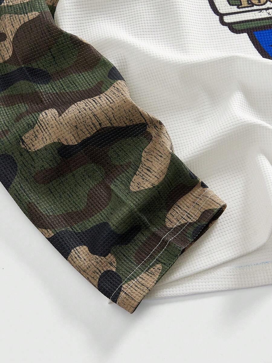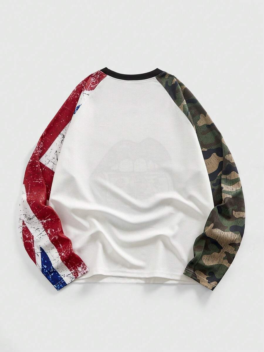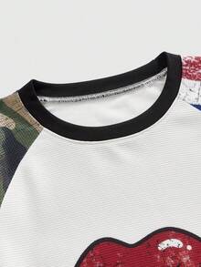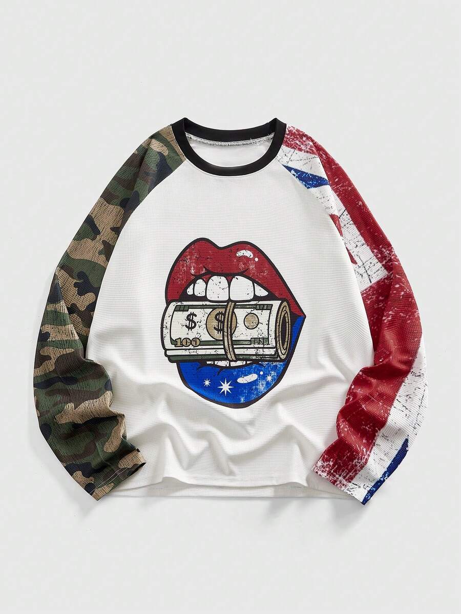 Street Life Men's Lip & Camouflage Print Patchwork Round Neck Raglan Long Sleeve T-Shirt