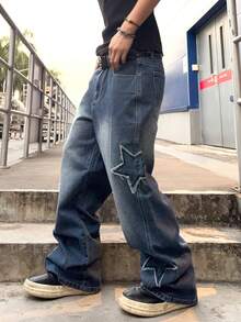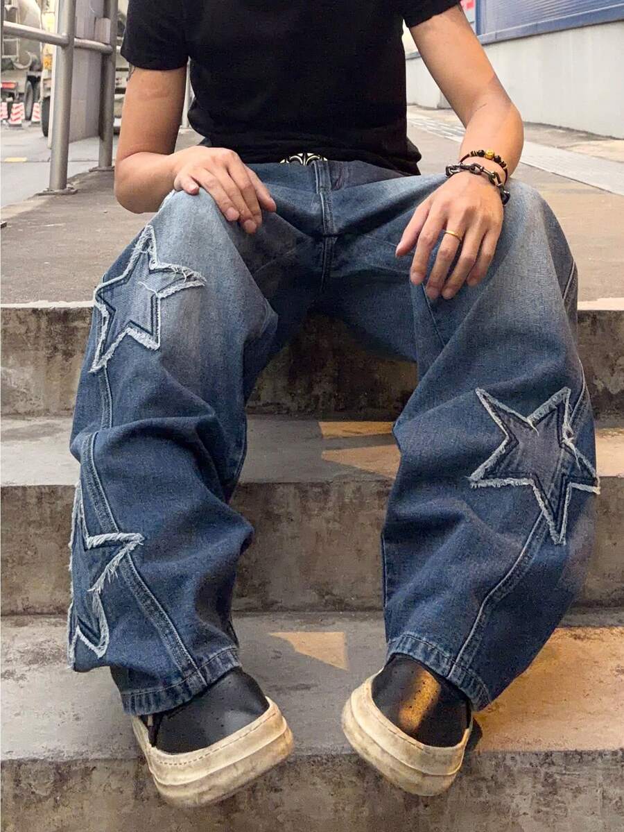 Street Life Men's Loose Fit Star Embroidered Denim Jeans