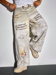 Street Life Men's Loose Street Lace Print Slant Pocket Jeans,