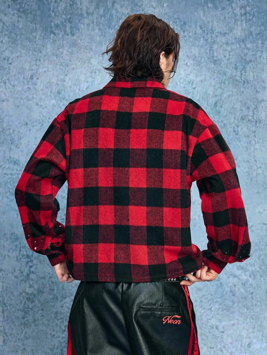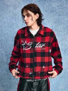 Street Life Men's Plaid Letter Embroidery Rhinestone Wool Blend Overcoat, Fall/Winter