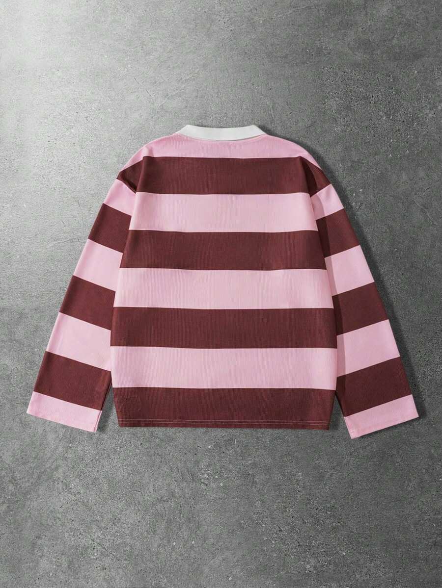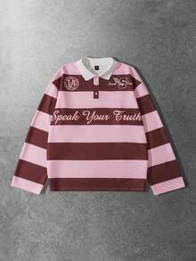 Street Life Men's Preppy Striped Letter Print Polo Collar Long Sleeve T-Shirt, Autumn
