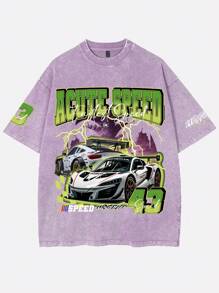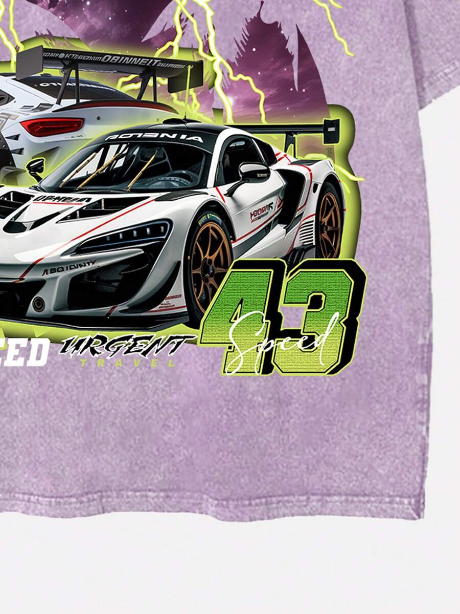 Street Life Men's Race Car Streetwear Printed Washed Crinkle Short Sleeve T-Shirt, Summer High Street Vintage Style, School