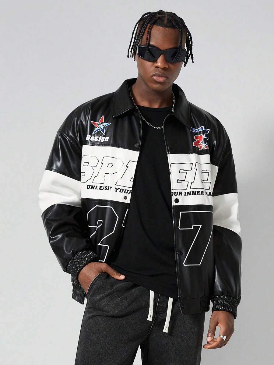 Street Life Men's Racing Letter Print Padded Faux Leather Jacket, Warm Thermal Outerwear For Autumn & Winter