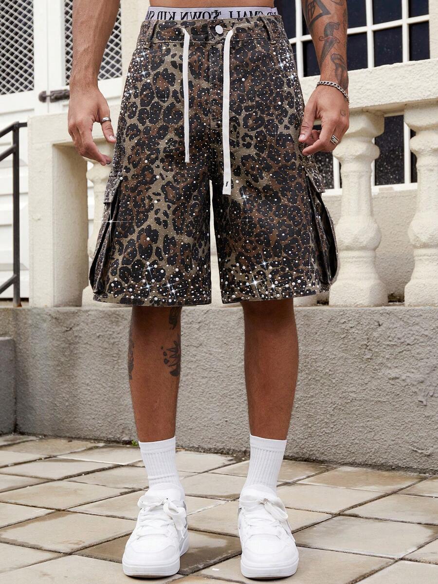 Street Life Men's Rhinestone Leopard Print Denim Shorts
